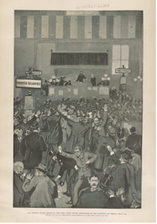 Broughton, Charles. „Scena recentă de panică de la Bursa de Valori din New York în dimineața zilei de vineri, 5 mai.” 1893. Fotografie. Biblioteca Congresului, Washington, DC